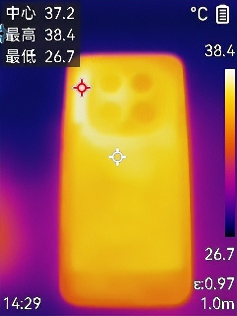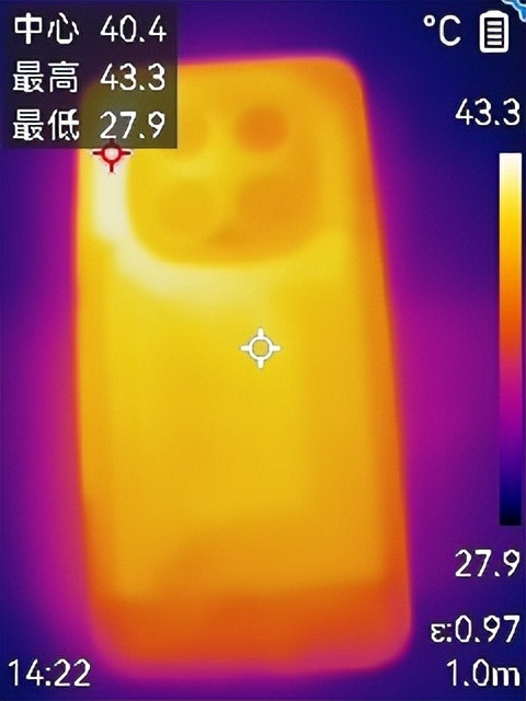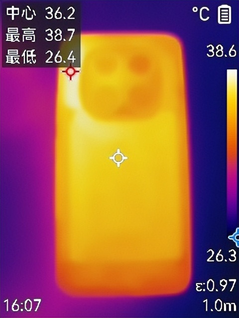 从热成像的图中,我们可以看出来,依靠着高效的散热模组,芯片所产出的的热量能够比较均匀的分布在手机周围,提供更持久的性能释放。
